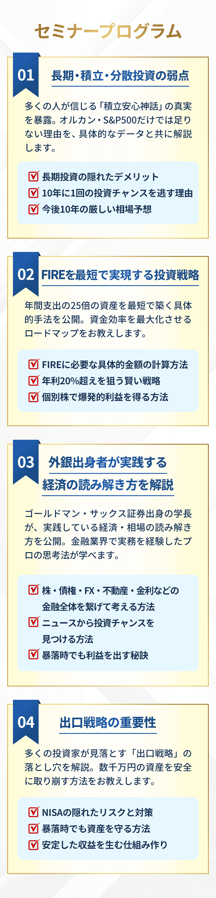 毎年数人しか採用されない新卒枠で採用された講師から、ニューヨーク、香港、日本で経験したことを基に、短期的な目先の利益ではなく、運用商品を見定める力、金融のプロとして働ける横断的な知識などをわかりやすくお伝えします。